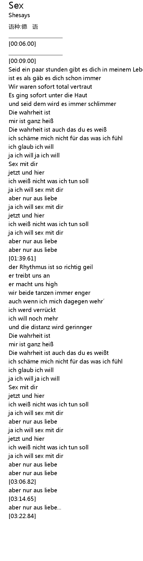 | [00:17.25] | Seid ein paar stunden gibt es dich in meinem Leben doch für mich |