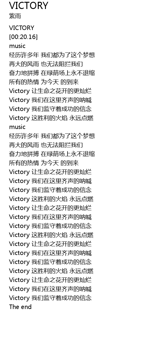 | [03:00.93] | Victory 我们在这里齐声的呐喊 |