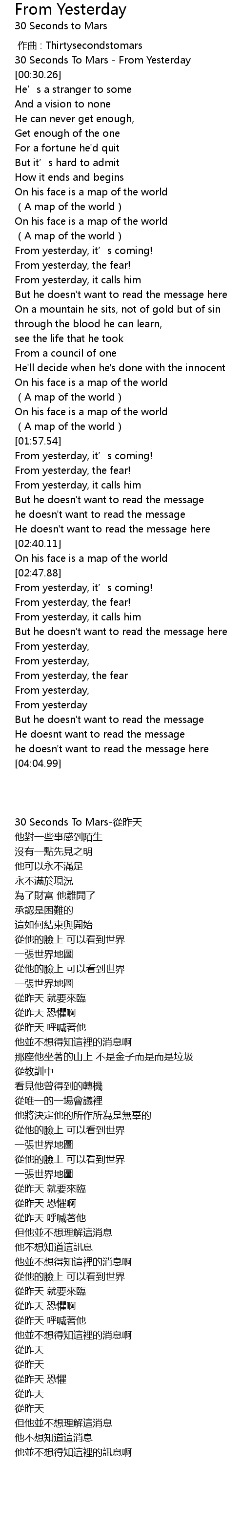 | [00:00.00] | 30 Seconds To Mars-從昨天 |