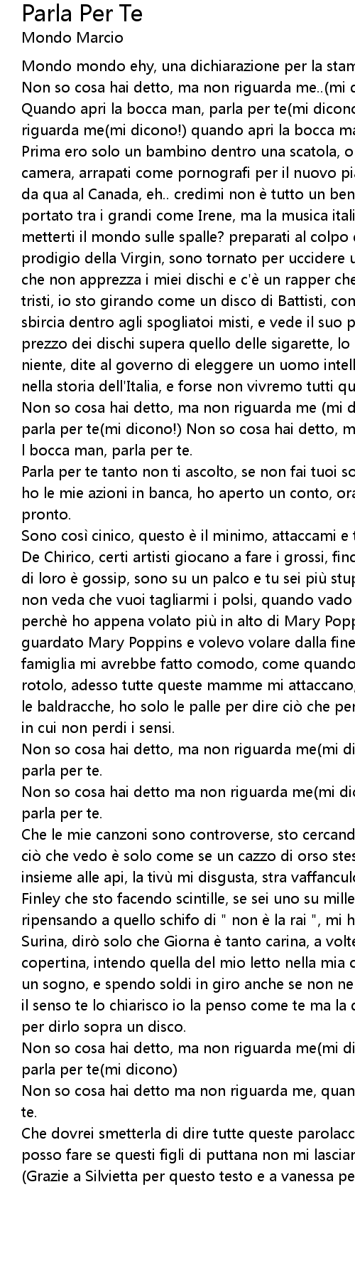 | Che le mie canzoni sono controverse, sto cercando di essere un Orson Welles, ciò che vedo è solo come se un cazzo di orso stesse, prendendo il miele insieme alle api, la tivù mi disgusta, stra vaffanculo Enrico Papi, e dite ai Finley che sto facendo scintille, se sei uno su mille ce la farai, sto vomitando ripensando a quello schifo di " non è la rai ", mi hanno chiesto: Ami Giorgia Surina, dirò solo che Giorna è tanto carina, a volte la immagino sulla copertina, intendo quella del mio letto nella mia camerina,, ehi è stato tutto un sogno, e spendo soldi in giro anche se non ne ho bisogno, se non ti è chiaro il senso te lo chiarisco io la penso come te ma la differenza è che ho le palle per dirlo sopra un disco. | |