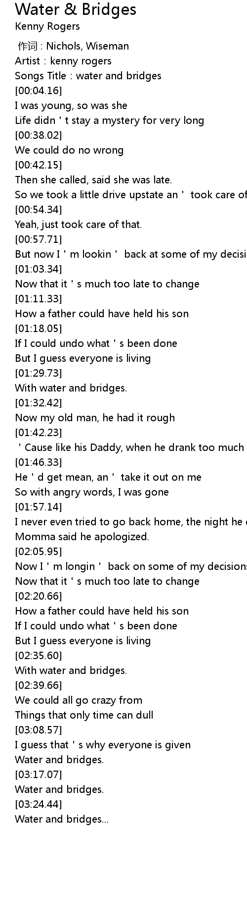 | [00:02.54] | Songs Title:water and bridges |