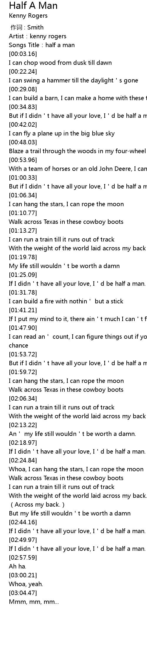 | [00:36.71] | But if I didn t have all your love, I d be half a man. |