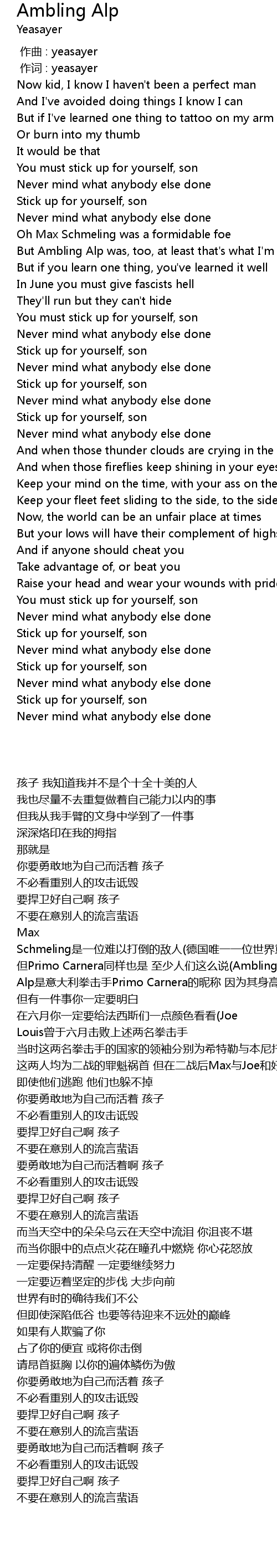 | [01:35.59] | 但Primo Carnera同样也是 至少人们这么说(Ambling Alp是意大利拳击手Primo Carnera的昵称 因为其身高1.97m) |
