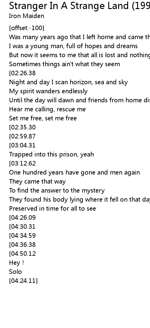 | [01:50.54][02:59.87][04:41.39][04:58.68][05:15.54] | Stranger in a strange land |