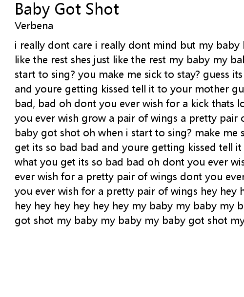 i really dont care i really dont mind but my baby baby baby got shot oh hes just like the rest shes just like the rest my baby my baby my baby got shot oh when i start to sing? you make me sick to stay? guess its what you get its so bad, bad and youre getting kissed tell it to your mother guess its what you get its so bad, bad oh dont you ever wish for a kick thats long? a kick thats long? dont you ever wish grow a pair of wings a pretty pair of wings my baby my baby my baby got shot oh when i start to sing? make me sick to stay? guess its what you get its so bad bad and youre getting kissed tell it to your mother guess its what you get its so bad bad oh dont you ever wish dont you ever wish dont you ever wish for a pretty pair of wings dont you ever wish dont you ever wish dont you ever wish for a pretty pair of wings hey hey hey hey hey hey hey hey hey hey hey hey hey hey hey hey my baby my baby my baby got shot my baby my baby my baby got shot my baby my baby my baby got shot my baby my baby my baby got shot oh no |