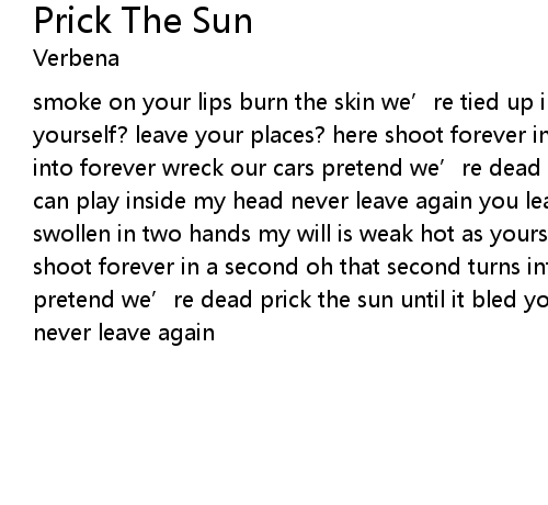 | smoke on your lips burn the skin we' re tied up in this my will is weak hot as yourself? leave your places? here shoot forever in a second oh that second turns into forever wreck our cars pretend we' re dead prick the sun until it bled you can play inside my head never leave again you leave me tired bruises and ? swollen in two hands my will is weak hot as yourself? leave your places here? shoot forever in a second oh that second turns into forever wreck our cars pretend we' re dead prick the sun until it bled you can play inside my head never leave again |
