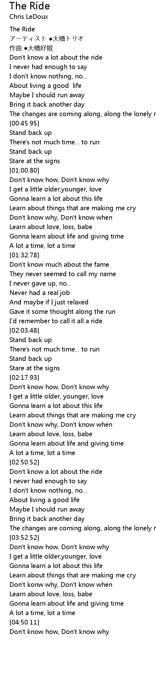 | [00:16.42] | Don't know a lot about the ride |