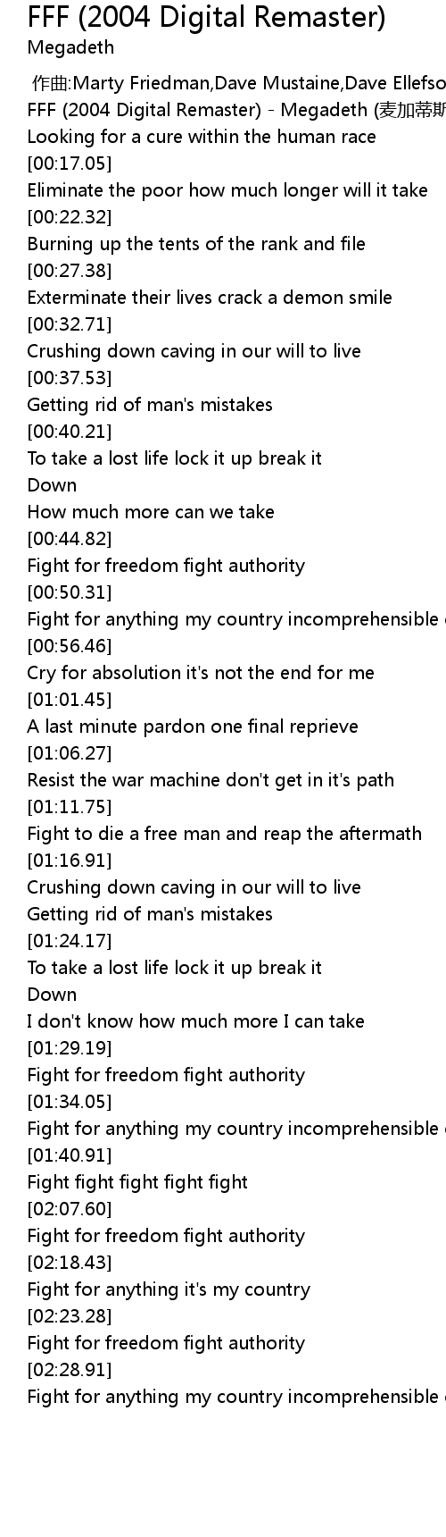 | [00:00.00] | FFF (2004 Digital Remaster) - Megadeth (麦加蒂斯) |