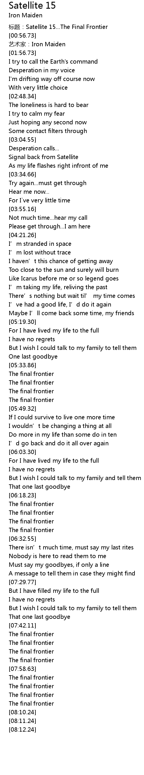 | [00:00.00] | biāo tí: Satellite 15... The Final Frontier |