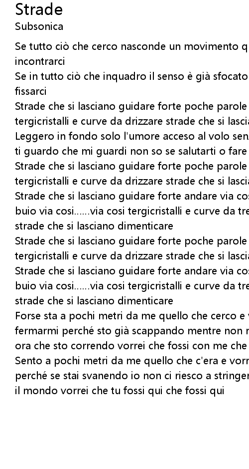 | Strade che si lasciano guidare forte andare via cosi poche parole piogge calde e buio via cosi via cosi tergicristalli e curve da tremare andare via cosi strade che si lasciano dimenticare | |