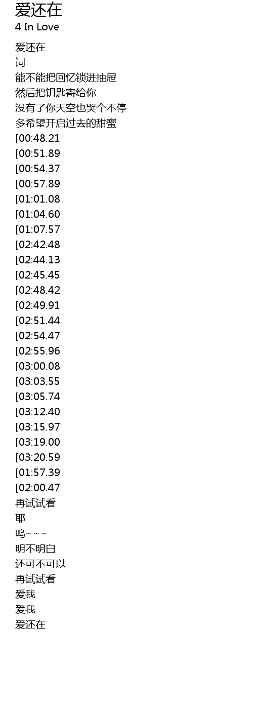 | [04:03.43][02:48.42][01:21.37] | 爱还在 |