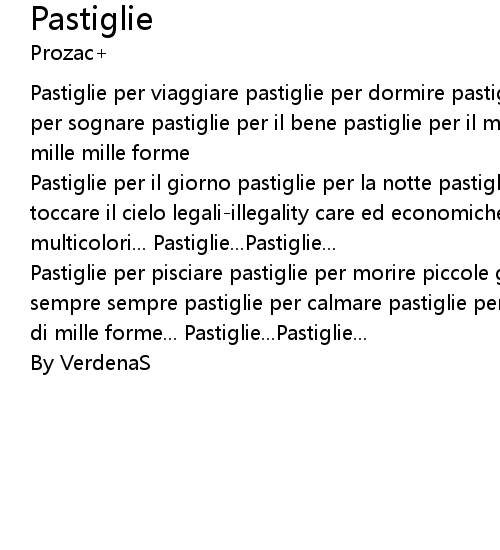 Pastiglie per pisciare pastiglie per morire piccole grandi medie pastiglie sempre sempre pastiglie per calmare pastiglie per parlare pastiglie per l'amore di mille forme... Pastiglie...Pastiglie... |