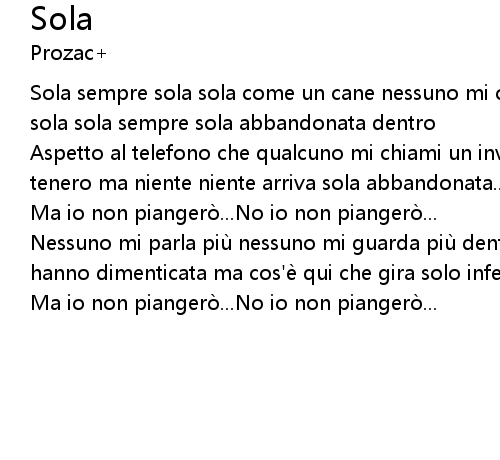 | Sola sempre sola sola come un cane nessuno mi cerca piu nessuno mi vuole no sola sola sempre sola abbandonata dentro | |