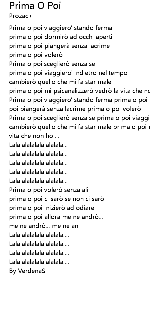 | Prima o poi viaggiero' stando ferma prima o poi dormiro ad occhi aperti prima o poi piangera senza lacrime prima o poi volero | |