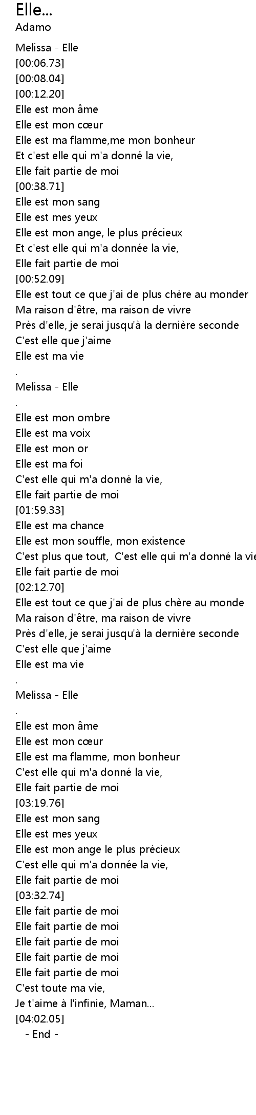 | [02:13.00] | Elle est tout ce que j' ai de plus che re au monde |