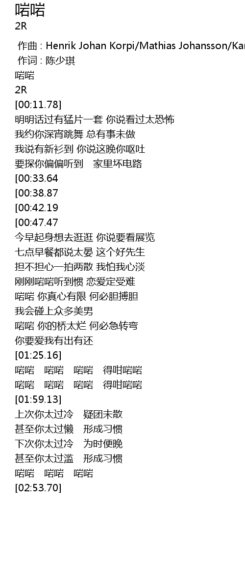 | [00:00.00] | 作曲 : Henrik Johan Korpi/Mathias Johansson/Karen Ann Poole |