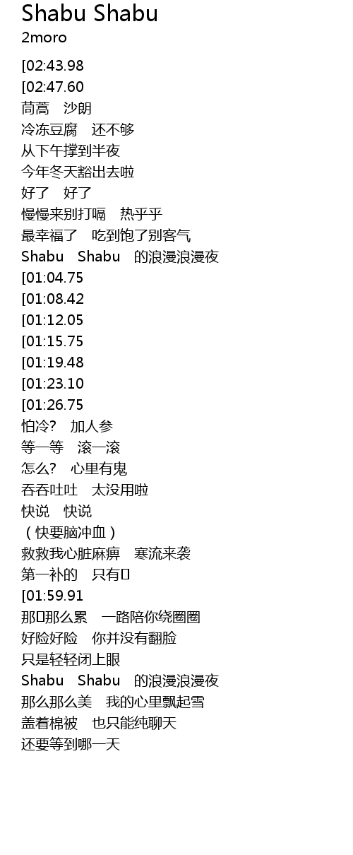 | [02:58.71][01:59.91] | Shabu Shabu de lang man lang man ye |