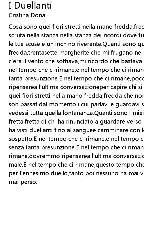 | Cosa sono quei fiori stretti nella mano fredda, fredda come questa sera che ci scruta nella stanza, nella stanza dei ricordi dove tu sei ritornatoper portarmi le tue scuse e un inchino riverente. Quanti sono quei fiori stretti nella mano fredda, trentasette margherite che mi frugano nel petto. Nella foto di un' estate c' era il vento che soffiava, mi ricordo che bastava l' equilibrio su una gamba. E nel tempo che ci rimane, e nel tempo che ci rimane, potremmo riparlarne senza tanta presunzione. E nel tempo che ci rimane, poco tempo che ci rimane, dovremmo ripensareall' ultima conversazioneper capire chi si è fatto più male. Cosa sono quei fiori stretti nella mano fredda, fredda che non sai contare quanti giorni son passatidal momento i cui parlavi e guardavi solo a terraper paura che vedessi tutta quella lontananza. Quanti sono i miei errori cancellati con la fretta, fretta di chi ha rinunciato a guardare verso il cielo, stesso cielo che ci ha visti duellanti fino al sanguee camminare con le scarpe appesantite dal sospetto. E nel tempo che ci rimane, e nel tempo che ci rimane, potremmo riparlarne senza tanta presunzione. E nel tempo che ci rimane, poco tempo che ci rimane, dovremmo ripensareall' ultima conversazioneper capire chi si è fatto più male. E nel tempo che ci rimane, questo tempo che ci rimanenon vorrei sprecarlo per l' ennesimo duello, tanto poi nessuno ha mai vinto, tanto sai che nessuno ha mai perso. |