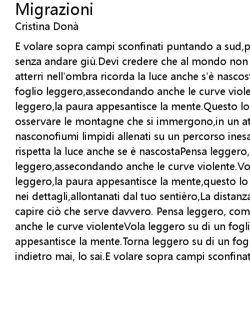 | E volare sopra campi sconfinati puntando a sud,poi toccare con le ali le tue ali senza andare giù.Devi credere che al mondo non c'è niente di impossibile.Se atterri nell'ombra ricorda la luce anche s'è nascosta.Pensa leggero, come un foglio leggero,assecondando anche le curve violente.Vola leggero su di un foglio leggero,la paura appesantisce la mente.Questo lo sai.Lo sai. E tornare ad osservare le montagne che si immergono,in un attimo planare sulle cime dove nasconofiumi limpidi allenati su un percorso inesauribile.Se resti nell'ombra rispetta la luce anche se è nascostaPensa leggero, come un foglio leggero,assecondando anche le curve violente.Vola leggero su di un foglio leggero,la paura appesantisce la mente,questo lo sai, lo sai.Se ti pèrdi ancora nei dettagli,allontanati dal tuo sentièro,La distanza spésso può aiutartia capire ciò che serve davvero. Pensa leggero, come un foglio leggeroassecondando anche le curve violenteVola leggero su di un foglio leggero,la paura appesantisce la mente.Torna leggero su di un foglio leggeroe non voltarti indietro mai, lo sai.E volare sopra campi sconfinati puntando a sud. |