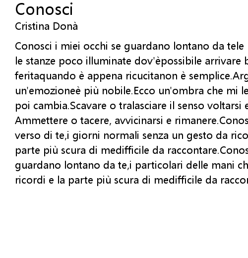 | Conosci i miei occhi se guardano lontano da tele mani che non so curare, conosci le stanze poco illuminate dov'e possibile arrivare bendati. Pronunciare una feritaquando e appena ricucitanon e semplice. Arginare la tensionecontenere un' emozionee piu nobile. Ecco un' ombra che mi legala certezza di qualcosa che poi cambia. Scavare o tralasciare il senso voltarsi e non guardare dentro Ammettere o tacere, avvicinarsi e rimanere. Conosci i miei occhi quando guardano verso di te, i giorni normali senza un gesto da ricordare. Conosci i colori e la parte piu scura di medifficile da raccontare. Conosci i miei occhi quando guardano lontano da te, i particolari delle mani che non so curare, conosci i ricordi e la parte piu scura di medifficile da raccontare. |