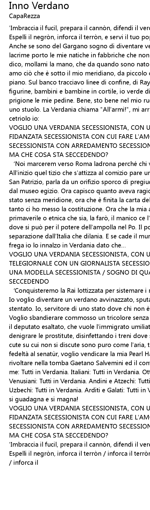 | Io voglio diventare un verdano avvinazzato, sputare parlando un italiano stentato. Io, servitore di uno stato dove chi non è come me viene discriminato. Voglio sbandierare commosso un tricolore senza bianco, né rosso. Voglio lodare il deputato esaltato, che vuole l' immigrato umiliato e percosso . Voglio denigrare le prostitute, disinfettando i treni dove sono sedute. Questione di cute su cui non si discute sono puro come l' aria, tutta salute. Voglio giurare fedeltà al senatù r, voglio vendicare la mia Pearl Harbour. Roba da fare rivoltare nella tomba Gaetano Salvemini ed il conte di Cavour. Allora fate come me: Tutti in Verdania. Italiani: Tutti in Verdania. Ottomani: Tutti in Verdania. Venusiani: Tutti in Verdania. Andini e Atzechi: Tutti in Verdania. Kazachi ed Uzbechi: Tutti in Verdania. Arditi e Galati: Tutti in Verdania, dove si lavora si guadagna e si magna! | |