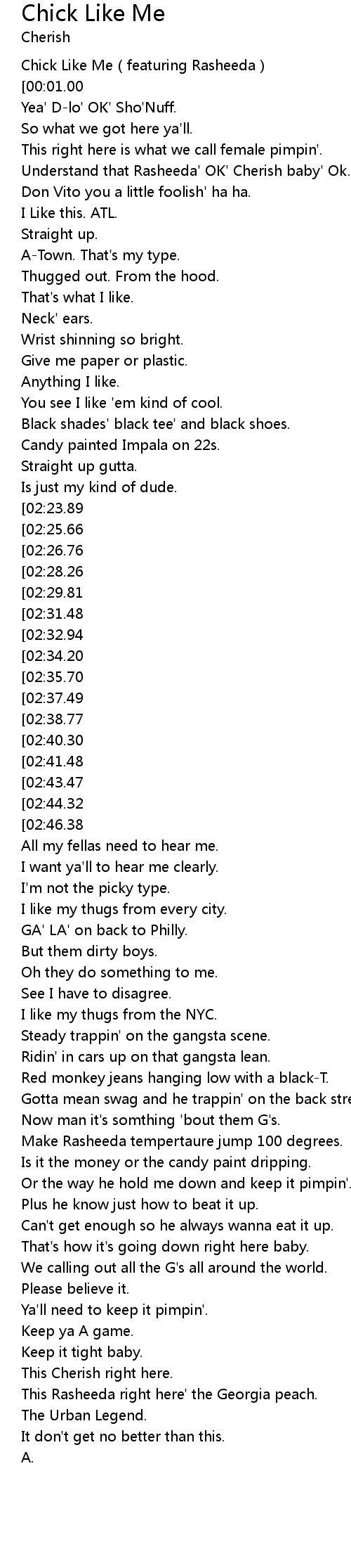 | [00:00.00] | Chick Like Me featuring Rasheeda |