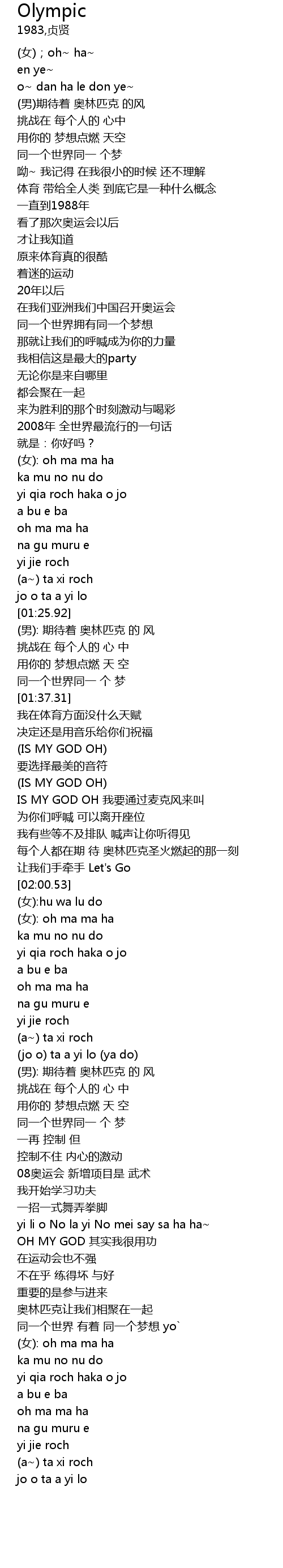 | [01:26.82] | (男): 期待着 奥林匹克 的 风 |