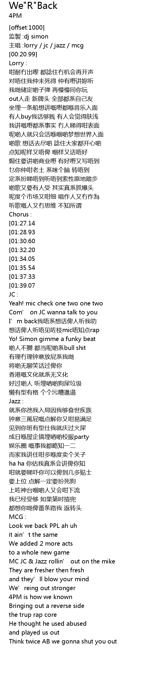 | [03:58.01][01:30.60] | Yeah we back (4pm) |