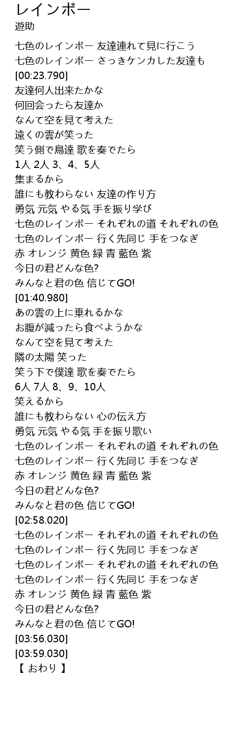 | [03:32.910] | 七色のレインボー 行く先同じ 手をつなぎ |
