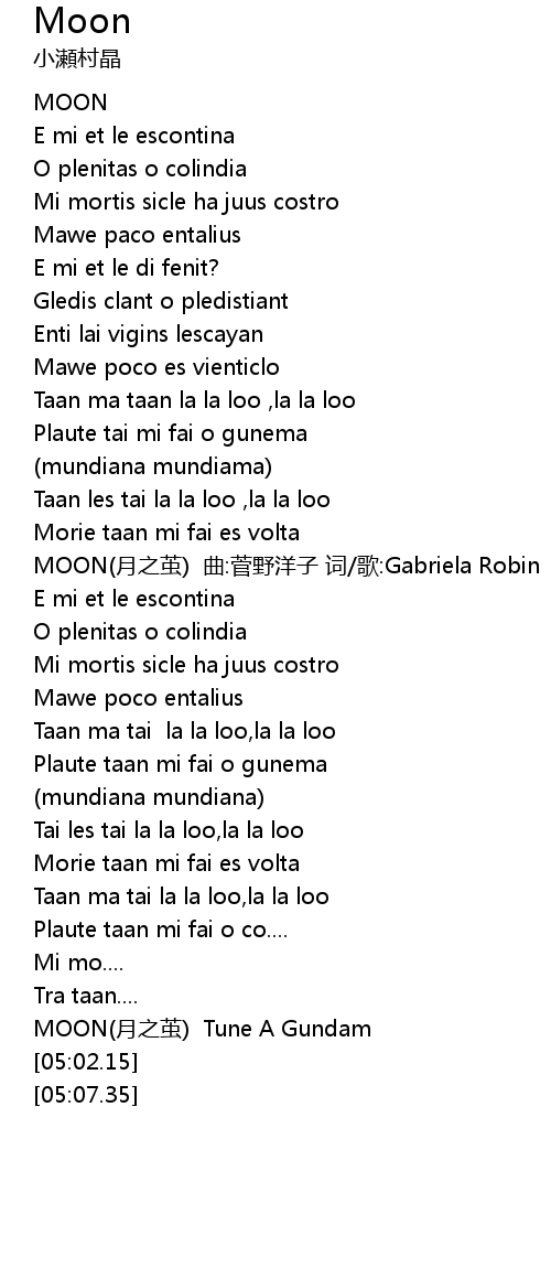 | [02:02.54] | MOON(月之茧) 曲:菅野洋子 词/歌:Gabriela Robin |