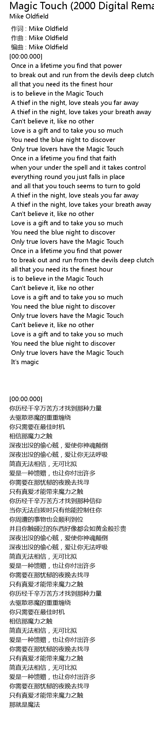 | [00:00.000] | 编曲 : Mike Oldfield |
