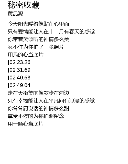 | [03:07.33][02:31.69][01:02.36] | 这就是我秘密的收藏 oh... |