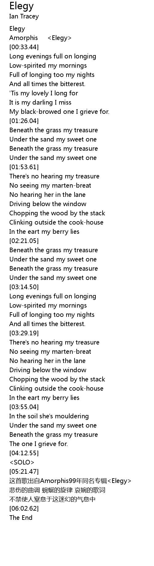 | [05:35.24] | zhe shou ge chu zi Amorphis99 nian tong ming zhuan ji Elegy |