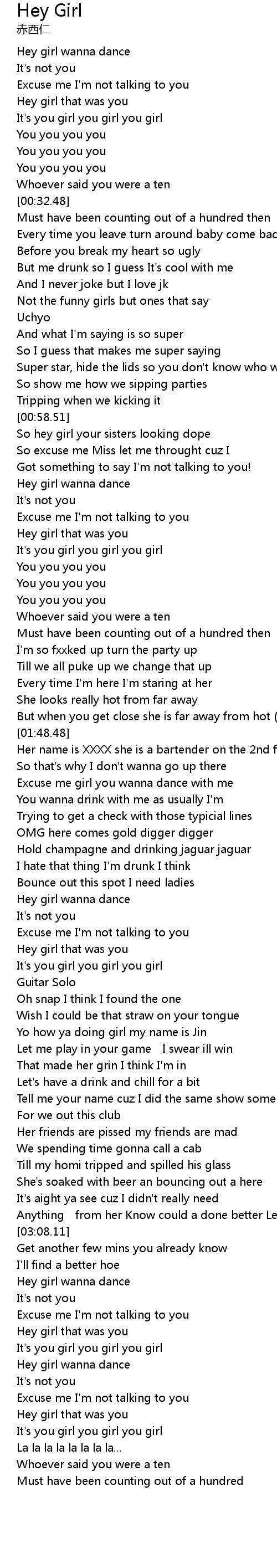 | [02:09.22] | Hey girl wanna dance |