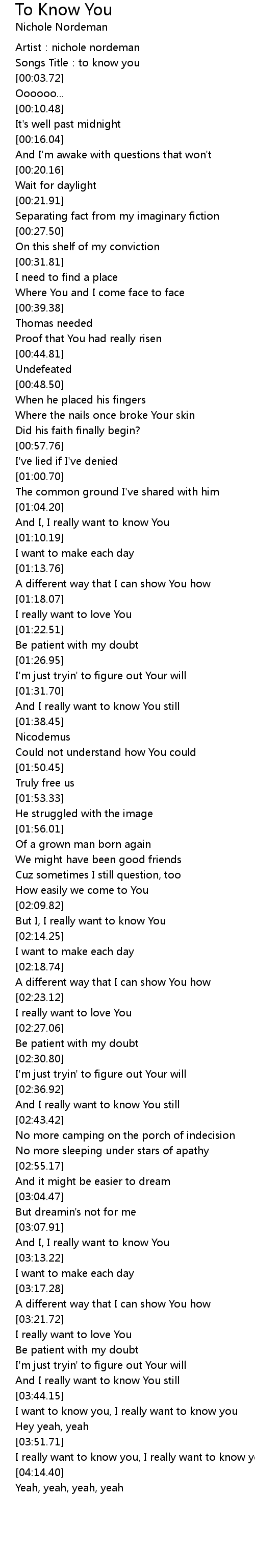 | [00:01.48] | Artist: nichole nordeman |