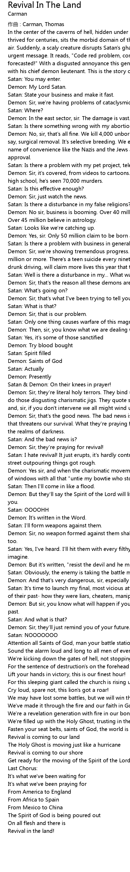 | Satan: I hate revival! It just erupts, it' s hardly controllable. At the Azusa street outpouring things got rough. | |