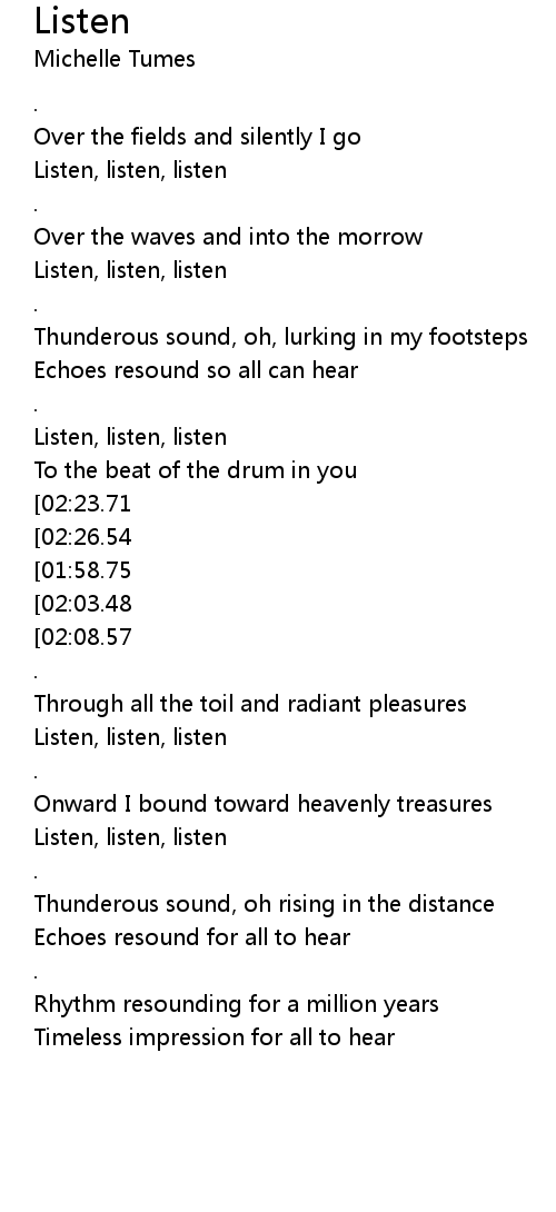 [02:44.28][02:08.57][01:12.27] Listen, listen, listen