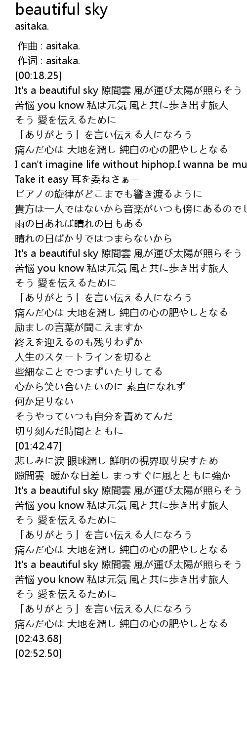 | [02:02.51] | It's a beautiful sky 隙間雲 風が運び太陽が照らそう |