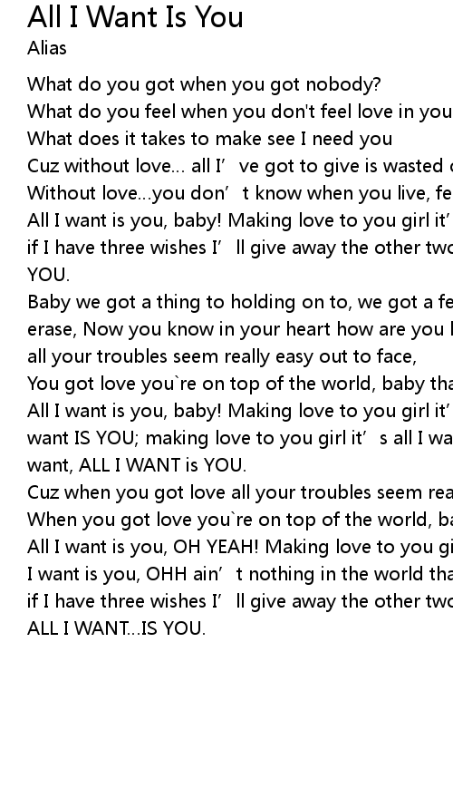 | All I want is you, OH YEAH! Making love to you girl it' s all I want to do, all I want is you, OHH ain' t nothing in the world that love would see it through, if I have three wishes I' ll give away the other two Cuz baby all I want, ALL I WANT IS YOU. |