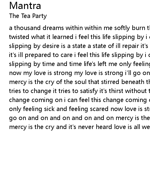 a thousand dreams within within me softly burn they burn the savage soul that twisted what it learned i feel this life slipping by i can feel this life slipping by desire is a state a state of ill repair it's ill prepared to cope it's ill prepared to care i feel this life slipping by i can feel this life slipping by time and time life's left me only feeling sick and feeling scared now my love is strong my love is strong i'll go on and on and on and on and on mercy is the cry of the soul that stirred beneath the creeping vine a flower tries to change it tries to satisfy it's thirst without the rains i feel this change coming on i can feel this change coming on time and time life's left me only feeling sick and feeling scared now love is strong my love is strong i'll go on and on and on and on and on mercy is the cry of the soul that stirred mercy is the cry and it's never heard love is all we have love is all we need |