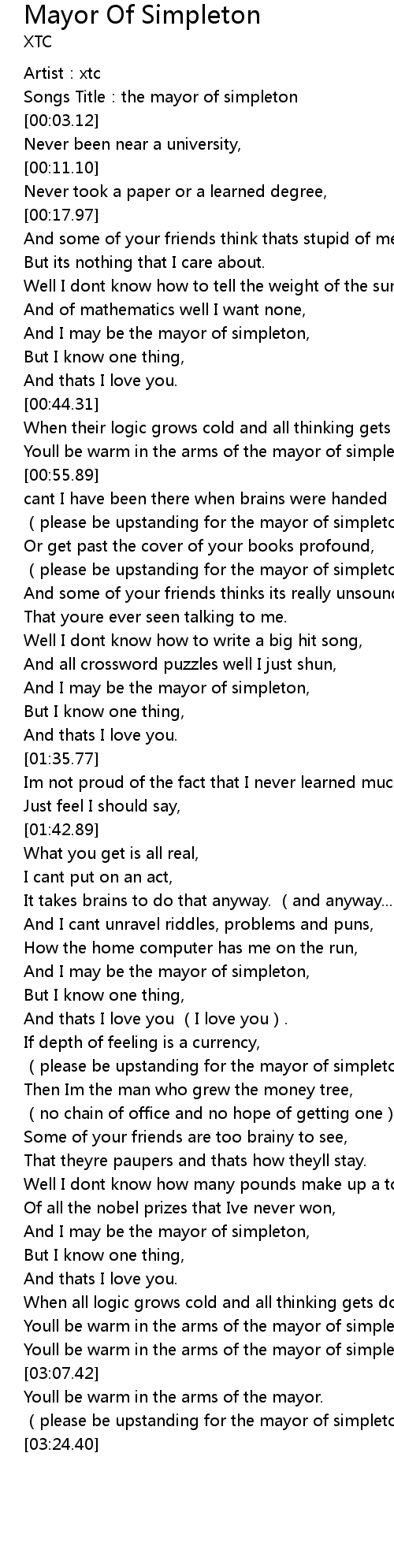 | [00:01.16] | Songs Title:the mayor of simpleton |