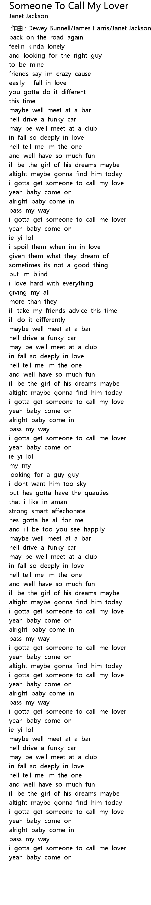 | [00:49.891] | i gotta get someone to call my love |