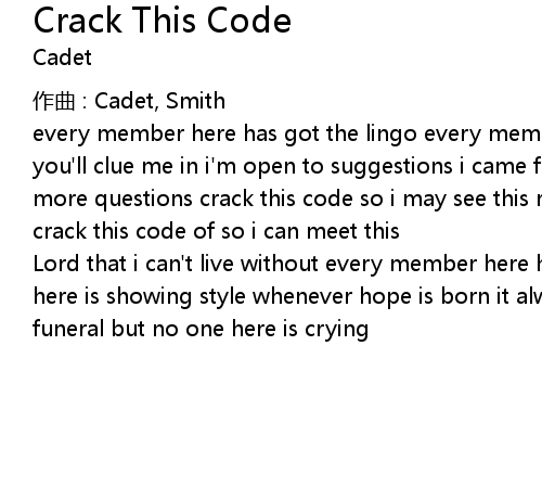 | every member here has got the lingo every member here is calling bingo maybe you' ll clue me in i' m open to suggestions i came for answers but instead i have more questions crack this code so i may see this road that you' re talking about crack this code of so i can meet this | |