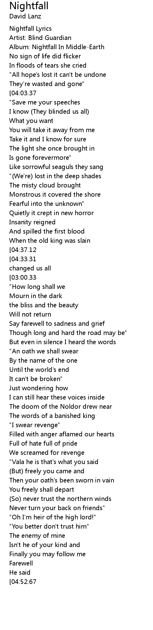 [04:44.66][04:37.12][04:29.55][02:56.76][02:49.31][02:42.01][01:30.47][01:23.14][01:16.06] Nightfall