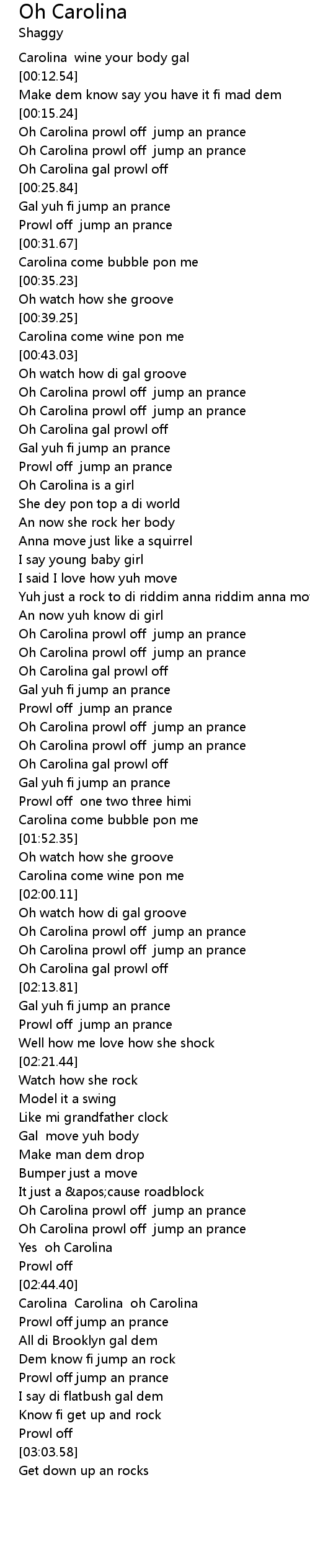 | [02:07.96] | Oh Carolina prowl off jump an prance |