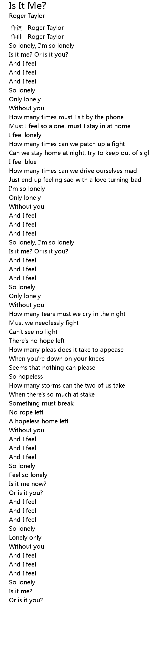 | [00:41.909] | Must I feel so alone, must I stay in at home |