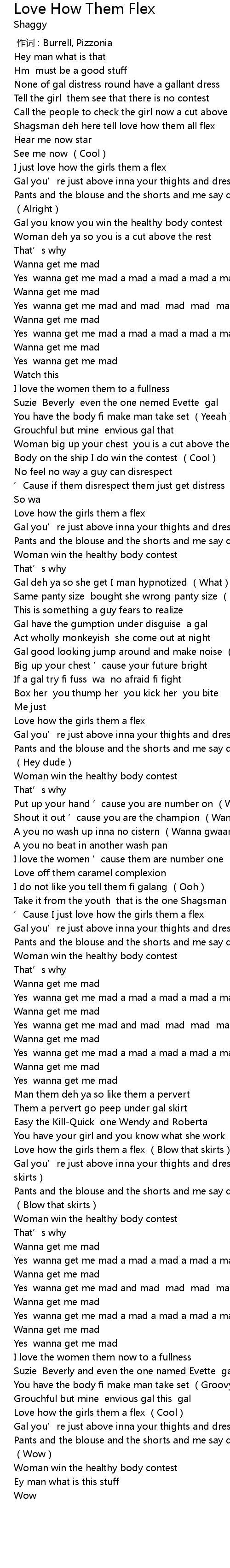 | [00:17.69] | Shagsman deh here tell love how them all flex |