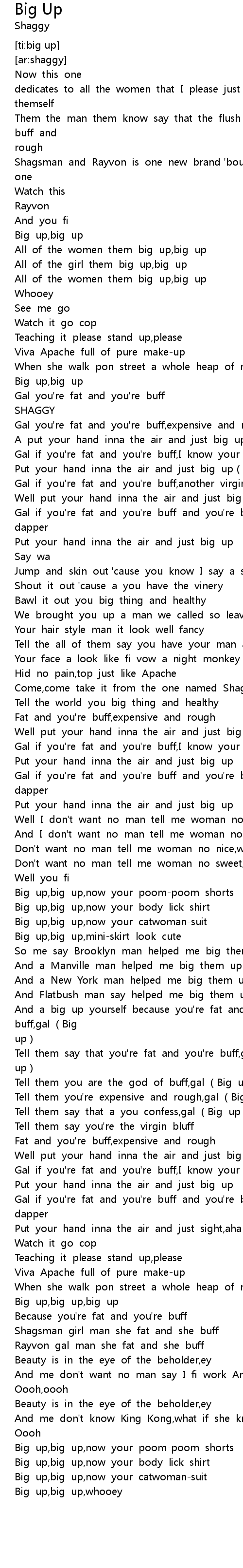 | [02:10.594] | And a big up yourself because you' re fat and you' re buff, gal Big |
