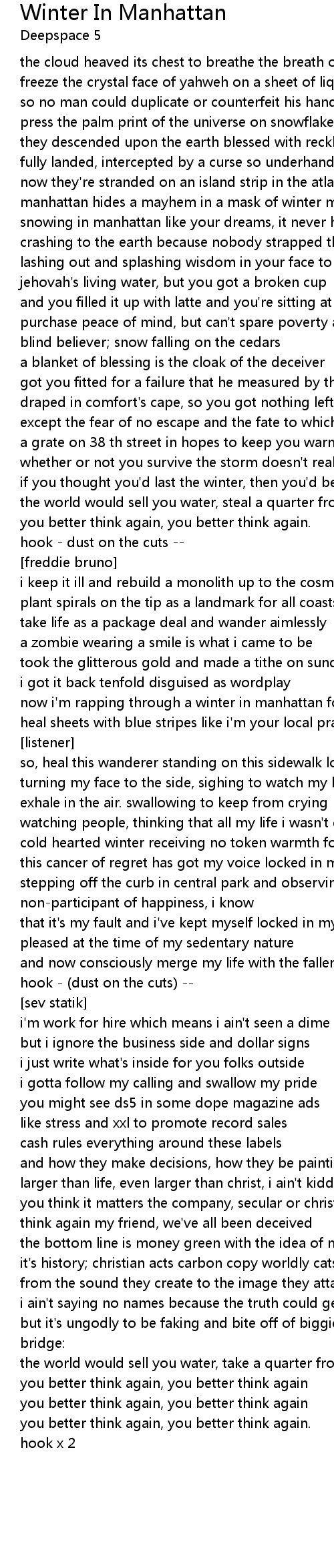 now i'm rapping through a winter in manhattan for the listener