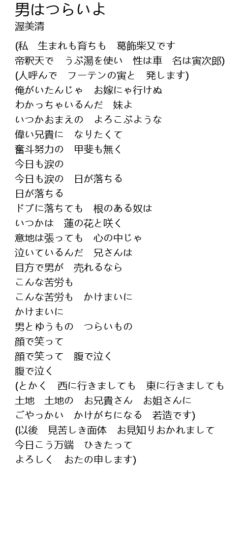 | [00:18.75] | 帝釈天で うぶ湯を使い 性は車 名は寅次郎) |